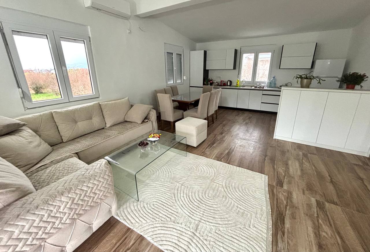 Iznajmljuje se na duzi period sprat novoizgrađene kuće. Sve je novo. Ima veoma veliki dnevni boravak, udobnu i prostranu kuhinju i dve spavace sobe, od kojih jedna ima sopstvenu malu terasu. Nova mašina za pranje sudova i veša, ogromna glavna terasa, veoma svetao prostor, dvorište sa mogućnošću uzgoja povrća, parking za tri automobila, 7 minuta kolima do centra Bara.